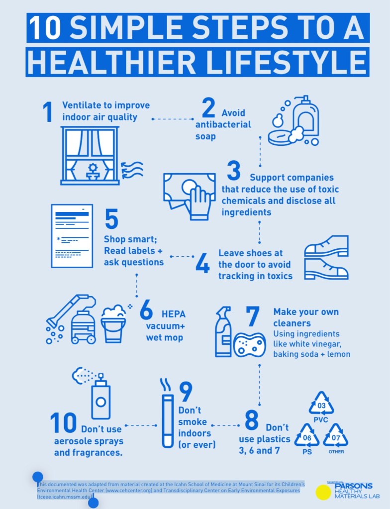Really inspecting materials began when we had children and all of a sudden we were looking at materials more closely along with health and safety. Children fall into a “vulnerable population” because they interact so closely with materials in the environment through touch, ingestion, aspiration in ways that we as adults do not. It’s through these eyes that we should view our environments and take action. Here are 10 simple steps to a healthier lifestyle as created by Parsons Healthy Materials Lab and adapted from material created at the Icahn School of Medicine at Mount Sinai for its Children’s Environmental Health Center (www.cehcenter.org) and Transdisciplinary Center on Early Environmental Exposures (tceee.icahn.mssm.edu). Download here with more in depth discussions to come on each step.